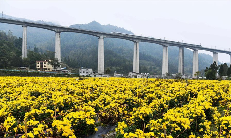 A bullet train runs over a chrysanthemum base in Jinxi Village of Xima Township, Longli County of southwest China's Guizhou Province, Oct. 27, 2020. Thanks to the chrysanthemum industry, 166 poverty-stricken households in Jinxi Village were lifted out of poverty in 2019. (Xinhua/Yang Wenbin)