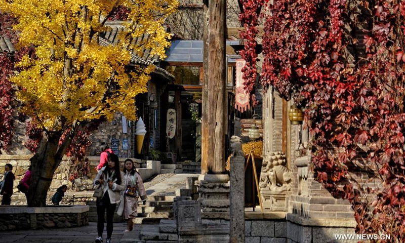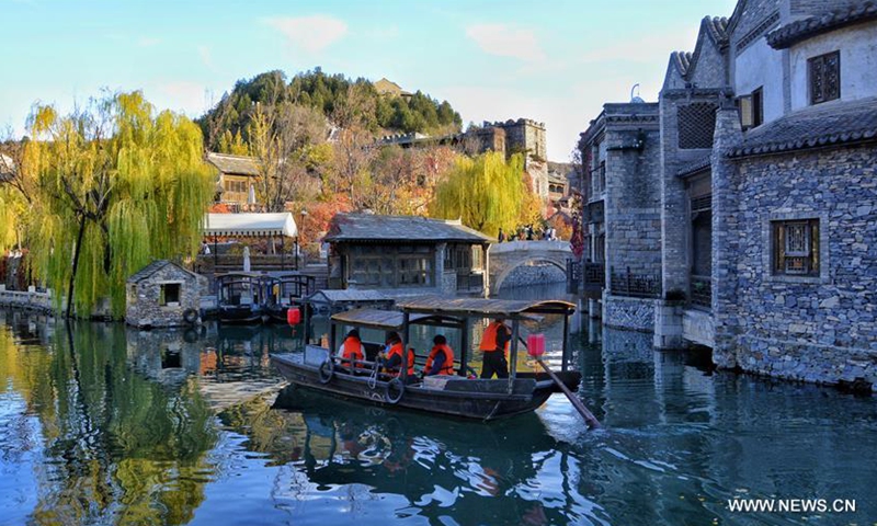 People enjoy the autumn scenery in Gubei Water Town in Beijing, capital of China, Oct. 29, 2020.Photo:Xinhua