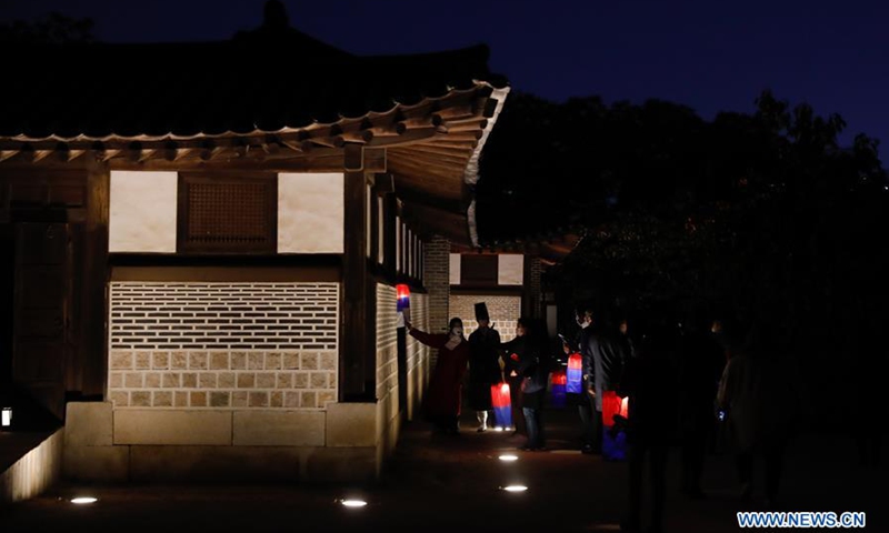 People with lanterns enjoy a moonlight tour within the Changdeokgung Palace in Seoul, South Korea, Oct. 29, 2020. Changdeokgung Palace was listed as a UNESCO world heritage site in 1997 and is regarded as a masterpiece of architecture as the buildings are in harmony with the natural settings.Photo:Xinhua