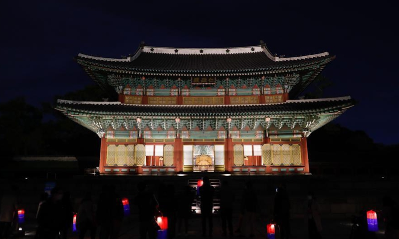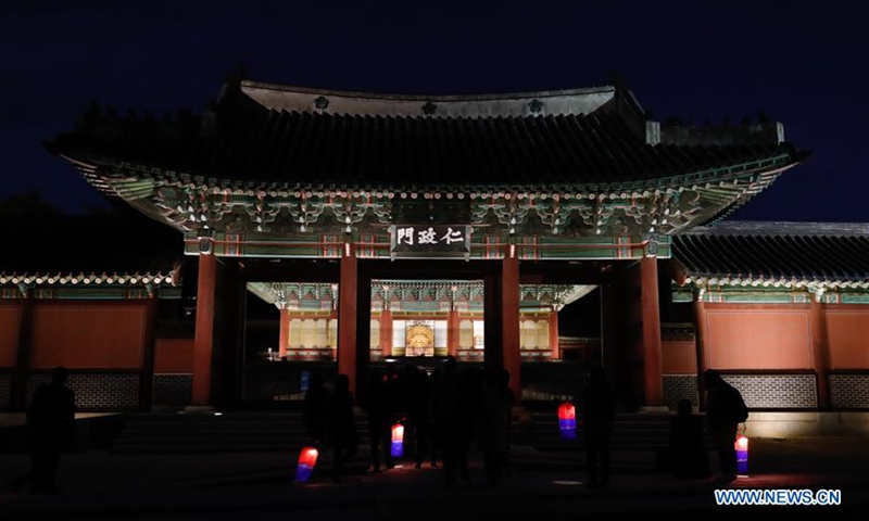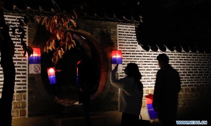 People with lanterns enjoy a moonlight tour within the Changdeokgung Palace in Seoul, South Korea, Oct. 29, 2020. Changdeokgung Palace was listed as a UNESCO world heritage site in 1997 and is regarded as a masterpiece of architecture as the buildings are in harmony with the natural settings. Photo:Xinhua