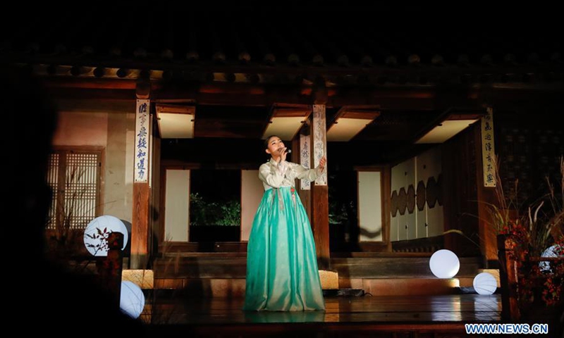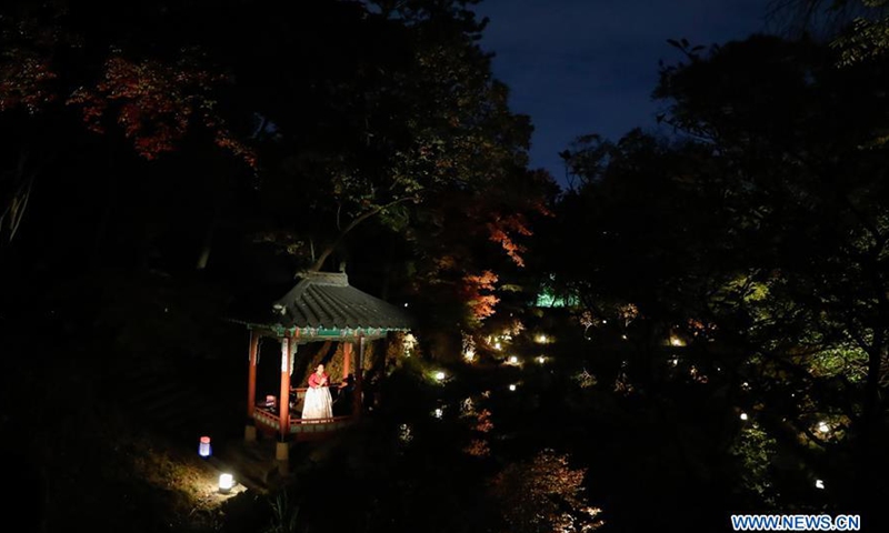 A performer showcases traditional performance at the secret garden of Changdeokgung Palace during a moonlight tour in Seoul, South Korea, Oct. 29, 2020. Changdeokgung Palace was listed as a UNESCO world heritage site in 1997 and is regarded as a masterpiece of architecture as the buildings are in harmony with the natural settings.Photo:Xinhua