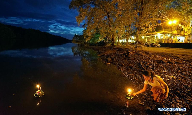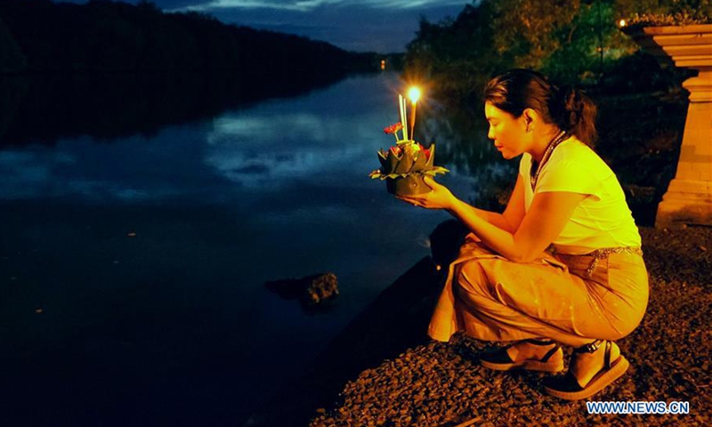 A woman prepares to release a water lantern in Bandar Seri Begawan, Brunei, Oct. 31, 2020. The Thailand's traditional Loy Krathong Festival falls on Saturday this year. About 250 people including some Thai people living in Brunei released water lanterns for peace and luck. (Photo by Jeffrey Wong/Xinhua)