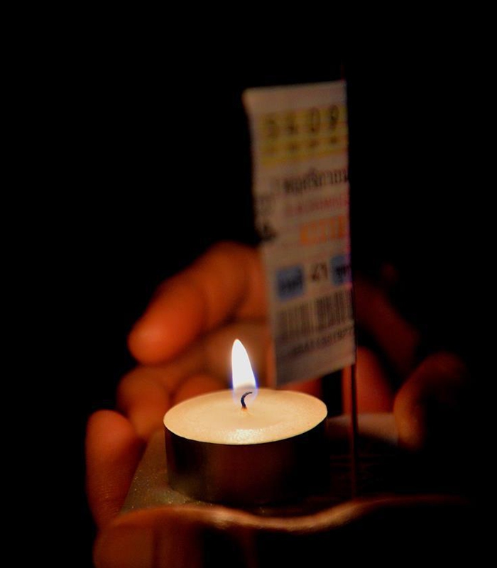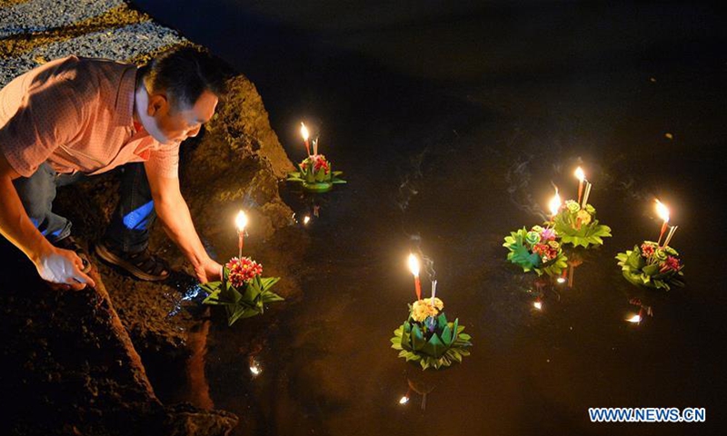 A man prepares to release a water lantern in Bandar Seri Begawan, Brunei, Oct. 31, 2020. The Thailand's traditional Loy Krathong Festival falls on Saturday this year. About 250 people including some Thai people living in Brunei released water lanterns for peace and luck. (Photo by Jeffrey Wong/Xinhua)