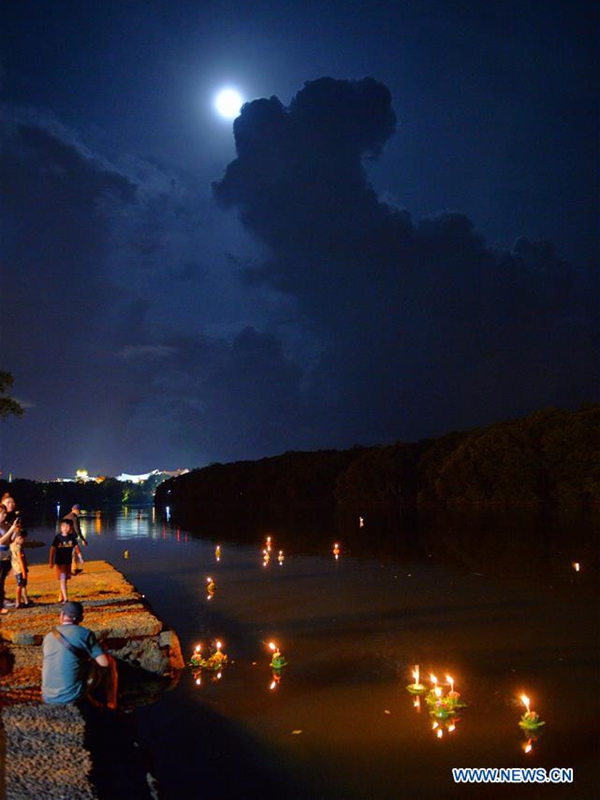 Water lanterns are seen in a river in Bandar Seri Begawan, Brunei, Oct. 31, 2020. The Thailand's traditional Loy Krathong Festival falls on Saturday this year. About 250 people including some Thai people living in Brunei released water lanterns for peace and luck. (Photo by Jeffrey Wong/Xinhua)