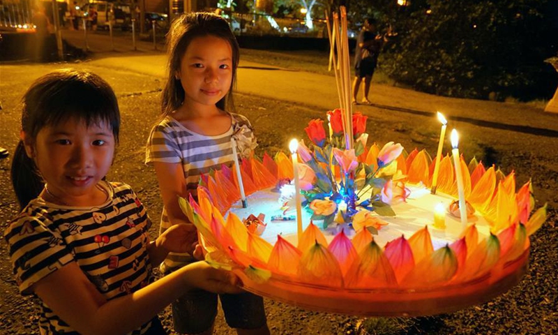 Children carry a water lantern to release in Bandar Seri Begawan, Brunei, Oct. 31, 2020. The Thailand's traditional Loy Krathong Festival falls on Saturday this year. About 250 people including some Thai people living in Brunei released water lanterns for peace and luck. (Photo by Jeffrey Wong/Xinhua)
