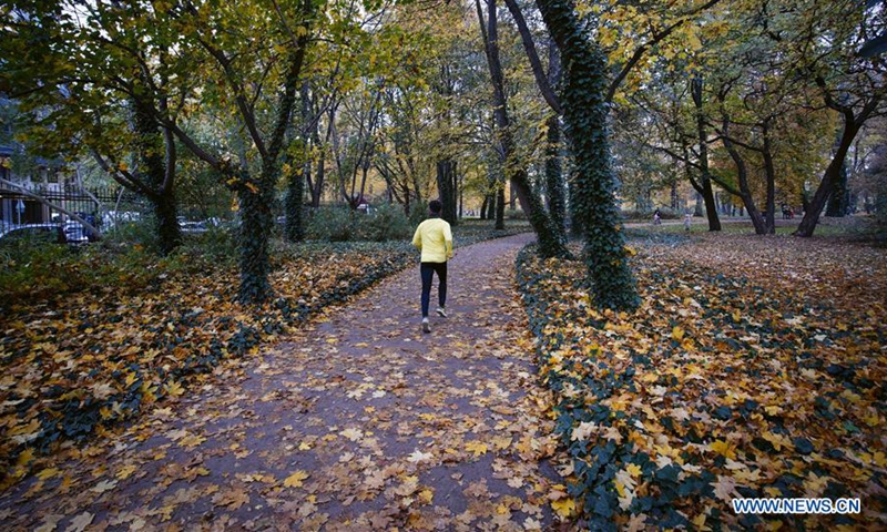 A man jogs at the Royal Lazienki Park in Warsaw, Poland on Oct. 31, 2020. (Photo by Jaap Arriens/Xinhua)