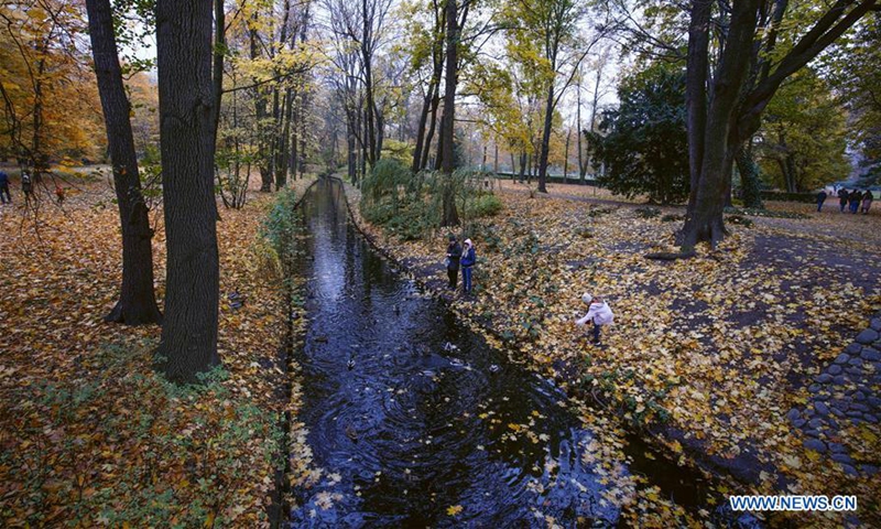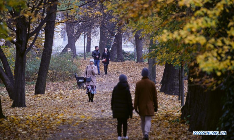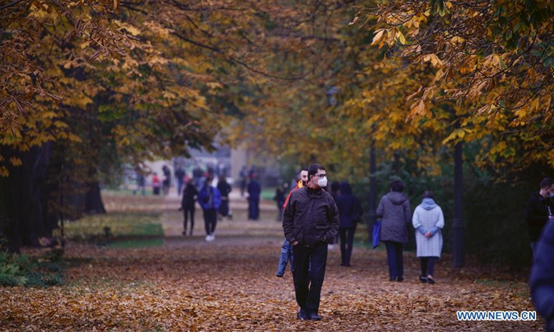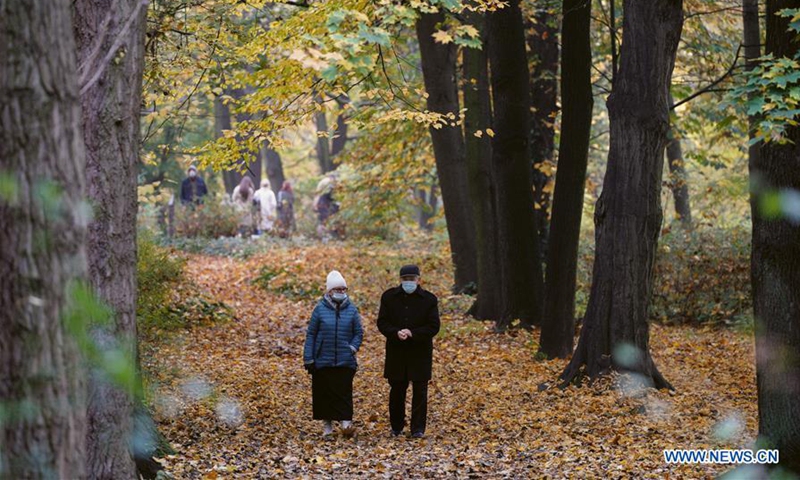 People walk in a path covered with brightly colored leaves at the Royal Lazienki Park in Warsaw, Poland on Oct. 31, 2020. (Photo by Jaap Arriens/Xinhua)