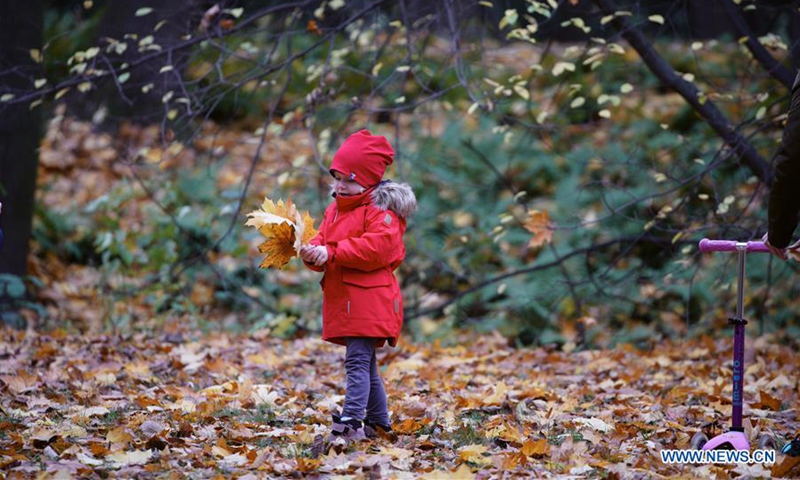 A young girl plays with fallen leaves at the Royal Lazienki Park in Warsaw, Poland on Oct. 31, 2020. (Photo by Jaap Arriens/Xinhua)