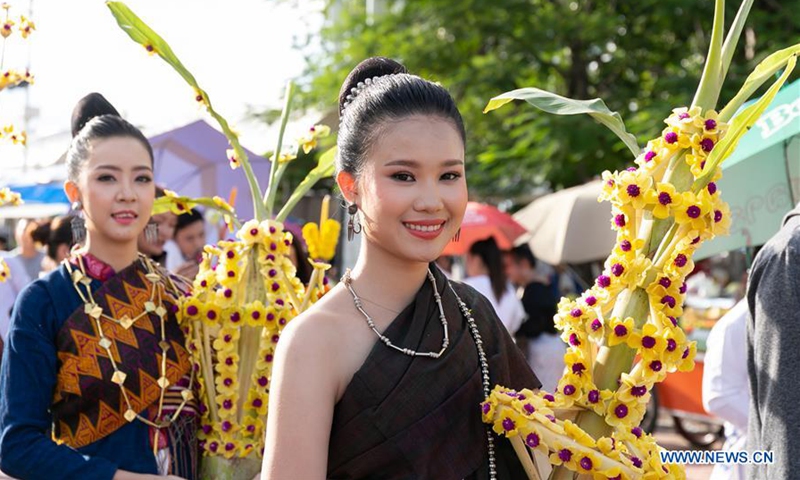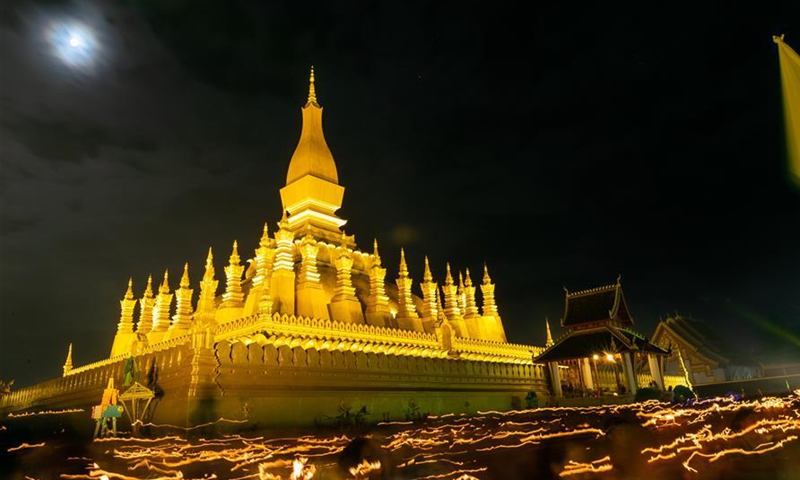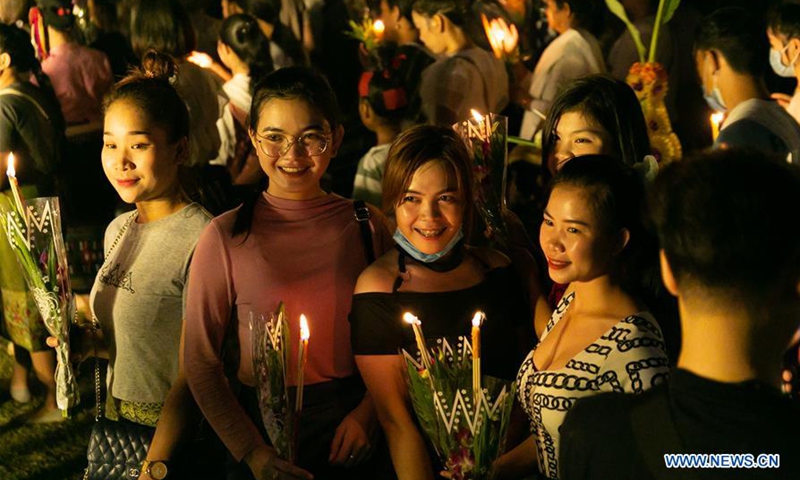People join the candlelight parade around the That Luang Stupa on the That Luang Festival in Vientiane, Laos, Oct. 31, 2020. The That Luang Festival, the most important religious festival in Laos, was observed by Lao people from all over the country around the That Luang Stupa. (Photo by Kaikeo Saiyasane/Xinhua)