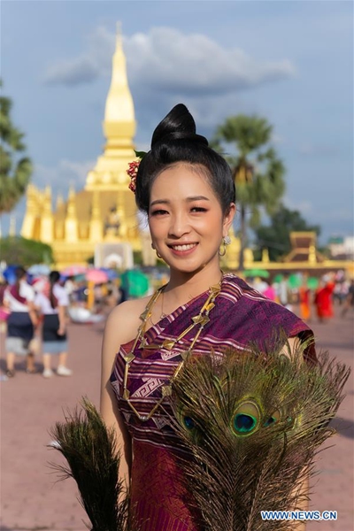 A Lao lady visits the That Luang Stupa one day before the That Luang Festival in Vientiane, Laos, Oct. 30, 2020. The That Luang Festival, the most important religious festival in Laos, was observed by Lao people from all over the country around the That Luang Stupa. (Photo by Kaikeo Saiyasane/Xinhua)