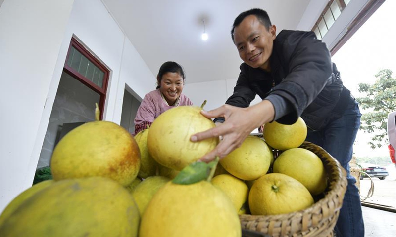 Farmers arrange pomelos in Zunyi City, southwest China's Guizhou Province, Oct. 31, 2020. A total of 100,000 mu (about 6,667 hectares) of pomelos ushered in harvest season recently in Zunyi. (Photo by Luo Xinghan/Xinhua)