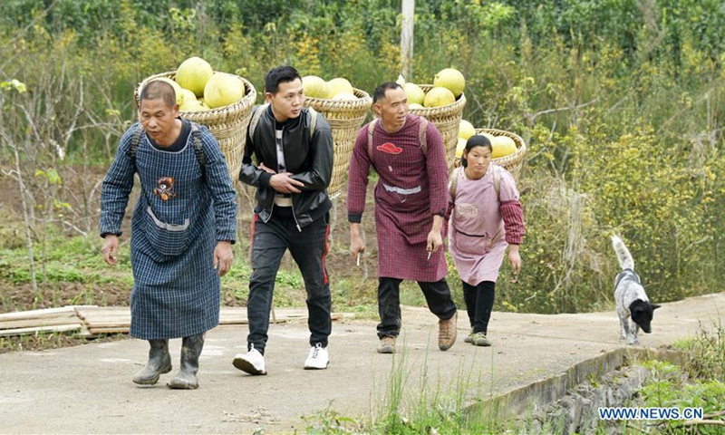 Farmers carry pomelos in Zunyi City, southwest China's Guizhou Province, Oct. 31, 2020. A total of 100,000 mu (about 6,667 hectares) of pomelos ushered in harvest season recently in Zunyi. (Photo by Luo Xinghan/Xinhua)