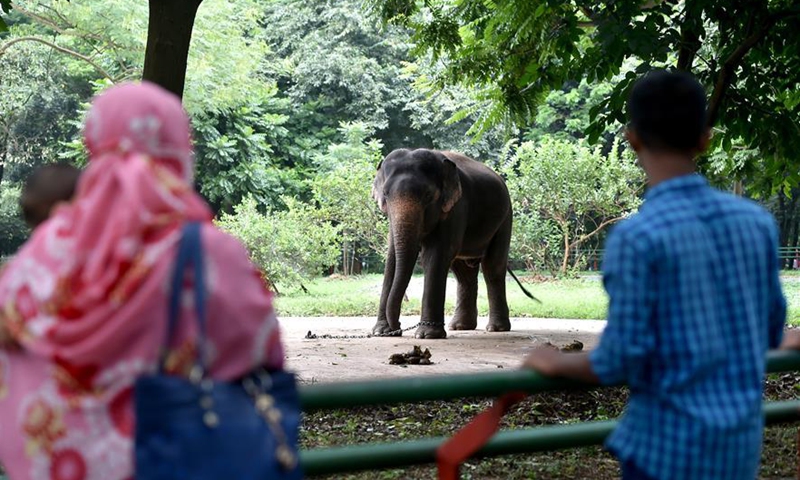 Visitors see elephant at the Bangladesh National Zoo in Dhaka, capital of Bangladesh, Nov. 1, 2020. Bangladesh National Zoo in the Mirpur section of capital Dhaka reopened to public Sunday with new safety guidelines after some eight months of shutdown due to the COVID-19 pandemic. (Xinhua)