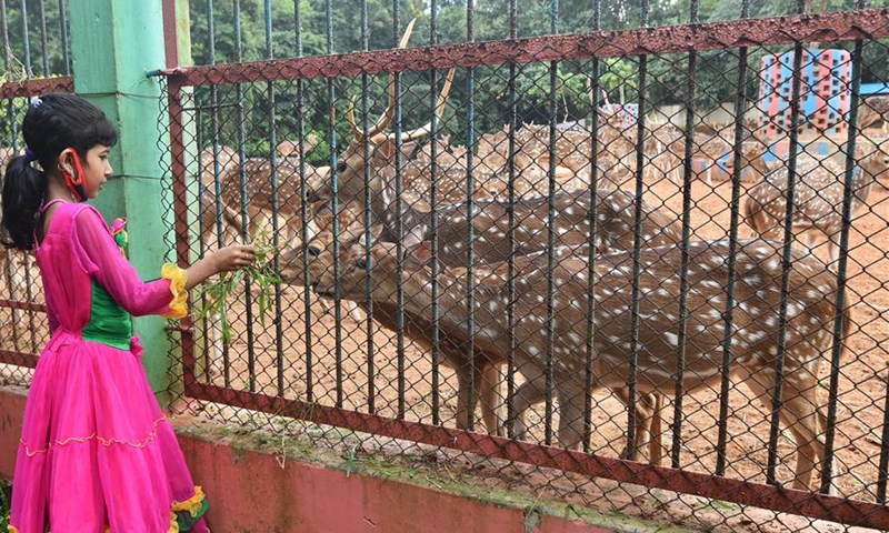 A child feeds deer at the Bangladesh National Zoo in Dhaka, capital of Bangladesh, Nov. 1, 2020. Bangladesh National Zoo in the Mirpur section of capital Dhaka reopened to public Sunday with new safety guidelines after some eight months of shutdown due to the COVID-19 pandemic. (Xinhua)