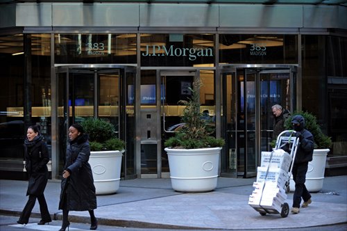 Pedestrians, including a US postal worker (right), pass by JPMorgan Chase & Co offices in New York, US. Photo: CFP