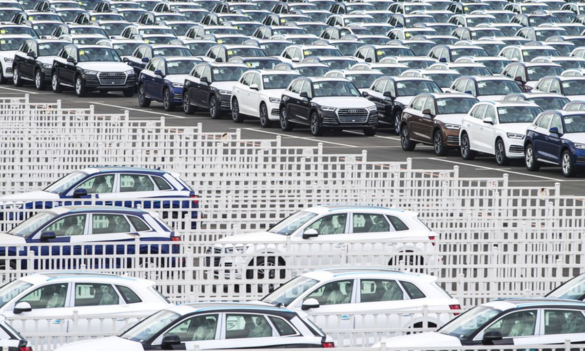 Photo taken on July 9, 2019 shows Audi vehicles awaiting transfer at the parking lot of FAW-Volkswagen in Changchun, northeast China's Jilin Province. (Xinhua/Xu Chang)