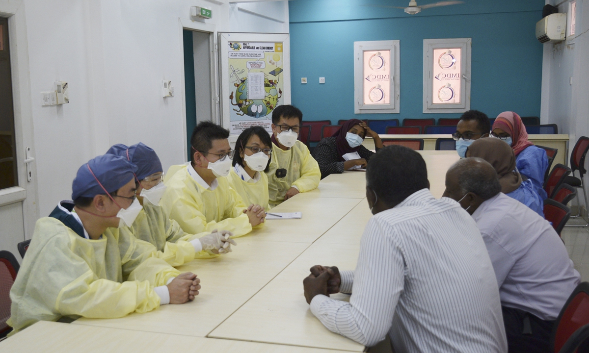 Chinese experts communicate with local medical workers at a hospital in Khartoum, Sudan, on June 2. The Chinese medical team arrived in Khartoum on May 28 from Algeria after ending its two-week anti-coronavirus mission there. Photo: Xinhua