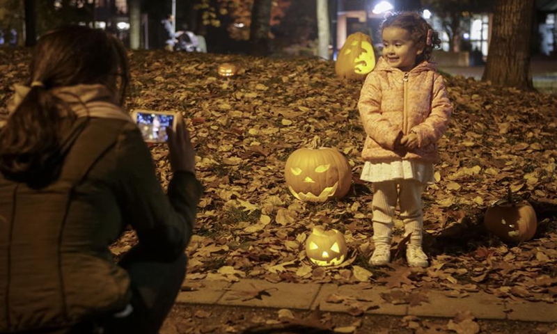 A child poses for photos with carved pumpkins during the third annual Pumpkin Parade at Nelson Park in Vancouver, British Columbia, Canada, Nov. 1, 2020. (Photo by Liang Sen/Xinhua)