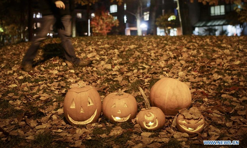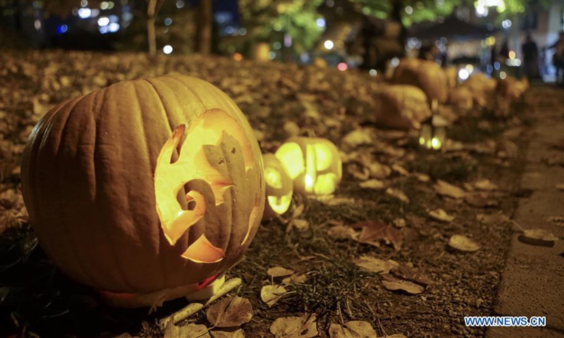 Carved pumpkins are displayed during the third annual Pumpkin Parade at Nelson Park in Vancouver, British Columbia, Canada, Nov. 1, 2020. (Photo by Liang Sen/Xinhua)