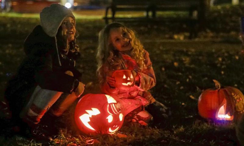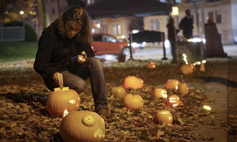 A resident tries to light up a carved pumpkin during the third annual Pumpkin Parade at Nelson Park in Vancouver, British Columbia, Canada, Nov. 1, 2020. (Photo by Liang Sen/Xinhua)