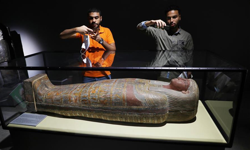 Visitors take photos in the Kafr El-Sheikh Museum in Kafr El-Sheikh, Egypt, on Nov. 2, 2020. The Kafr El-Sheikh Museum opened its door to visitors on Monday. The museum consists of three main exhibition halls, displaying the regional history and many artifacts uncovered in Kafr El-Sheikh Governorate. (Xinhua/Ahmed Gomaa)