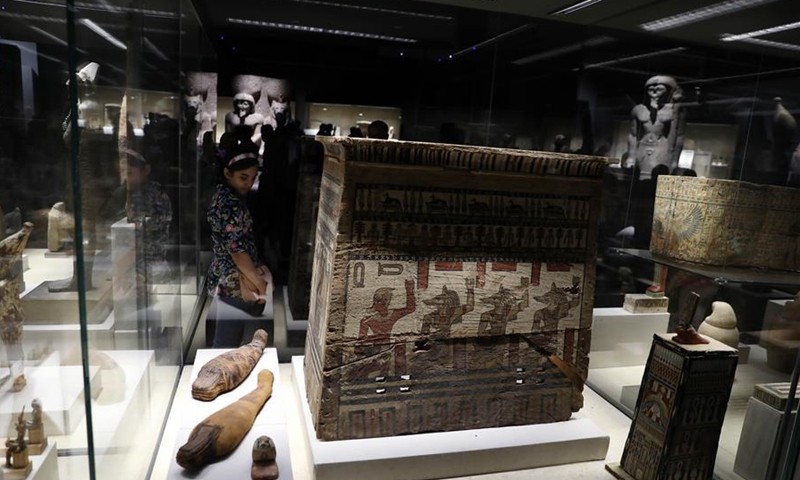 People visit the Kafr El-Sheikh Museum in Kafr El-Sheikh, Egypt, on Nov. 2, 2020. The Kafr El-Sheikh Museum opened its door to visitors on Monday. The museum consists of three main exhibition halls, displaying the regional history and many artifacts uncovered in Kafr El-Sheikh Governorate. (Xinhua/Ahmed Gomaa)
