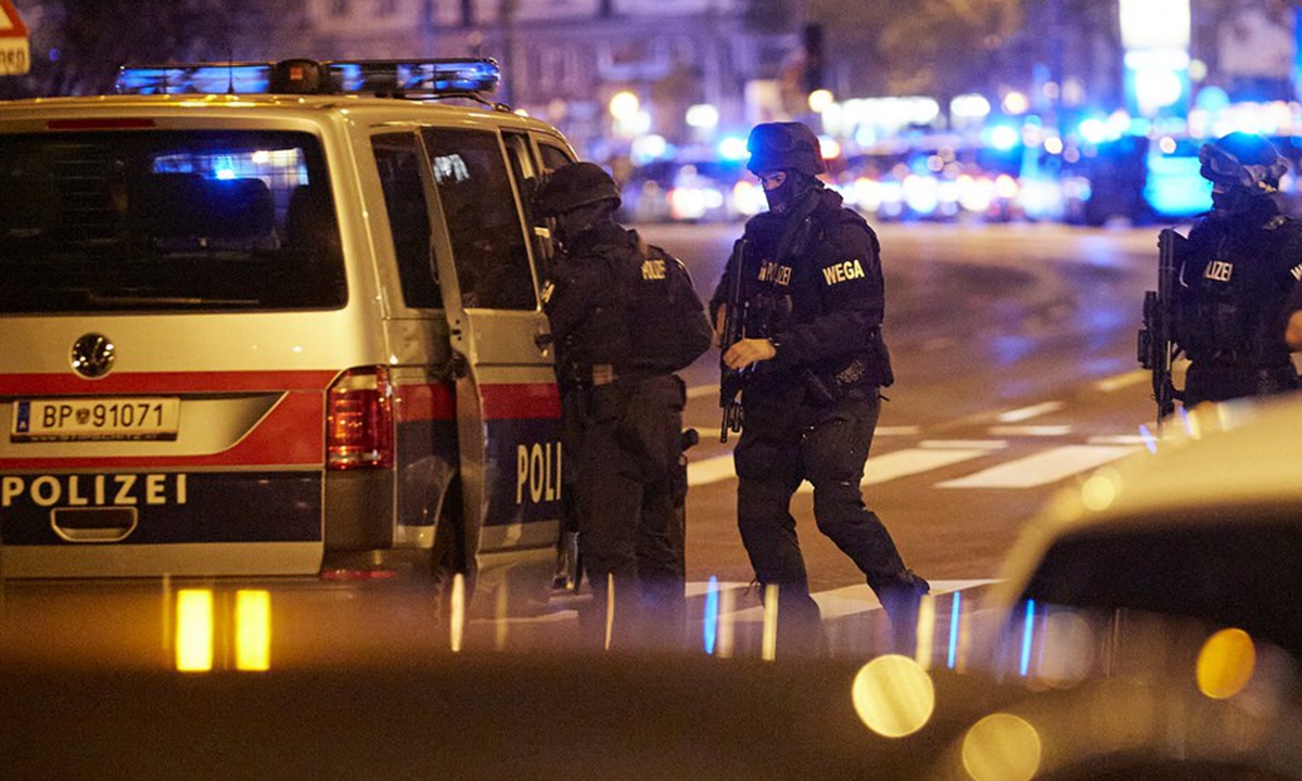 Police officers are on duty on a street in Vienna, capital of Austria, Nov. 2, 2020. (Photo by Georges Schneider/Xinhua)