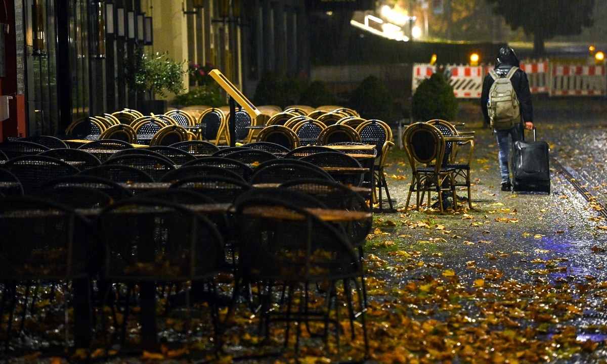 A man pulls a suitcase past locked tables and chairs outside closed restaurants as it rains in Cologne's old town in Germany on Monday amid the COVID-19 pandemic. Photo: AFP
