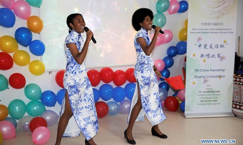 Confucius Institute twin alumni Sofia Mucunabitu and Loraini Mucunabitu sing the song "Go on" in a Fiji-China friendship singing competition in Suva, Fiji, Oct. 28, 2020. The Fiji-China friendship singing competition was held successfully in the Fijian capital of Suva on Wedensday to mark the 45th anniversary of the establishment of diplomatic relations between China and Fiji. Jointly organized by the Chinese Embassy to Fiji and the Confucius Institute at the University of the South Pacific (CI-USP) in Fiji, the singing competition attracted 18 contestants who are students from the Chinese credit class of the CI-USP and the social class of the CI-USP. It covers Chinese learners of different ages, different majors and different nationalities. (Xinhua/Zhang Yongxing)