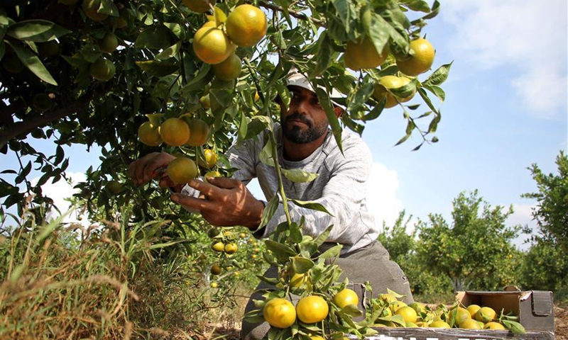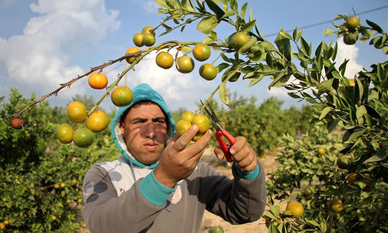 A farmer picks citruses at a citrus planting farm in the southern Gaza Strip city of Khan Younis, on Nov. 3, 2020. Citruses in the Gaza Strip have entered the harvest season. (Photo by Rizek Abdeljawad/Xinhua)