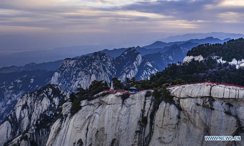 Aerial photo taken on Nov. 3, 2020 shows the East Peak of Mount Huashan at dawn in northwest China's Shaanxi Province. (Xinhua/Tao Ming)