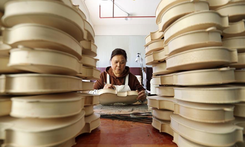 A worker makes a violin at a workshop in Huangqiao Town of Taixing, east China's Jiangsu Province, Nov. 3, 2020. As a famed bowed string instruments manufacturing area in China, Huangqiao Town now has over 200 manufacturers and companies with more than 35,000 employees in the industry. Over 700,000 bowed string instruments are produced here every year, accounting for about 30 percent of the total number made in the world. (Photo by Tang Dehong/Xinhua)