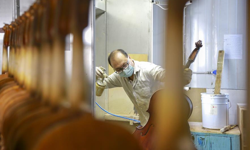 A worker sprays paint at a workshop in Huangqiao Town of Taixing, east China's Jiangsu Province, Nov. 3, 2020. As a famed bowed string instruments manufacturing area in China, Huangqiao Town now has over 200 manufacturers and companies with more than 35,000 employees in the industry. Over 700,000 bowed string instruments are produced here every year, accounting for about 30 percent of the total number made in the world. (Photo by Tang Dehong/Xinhua)