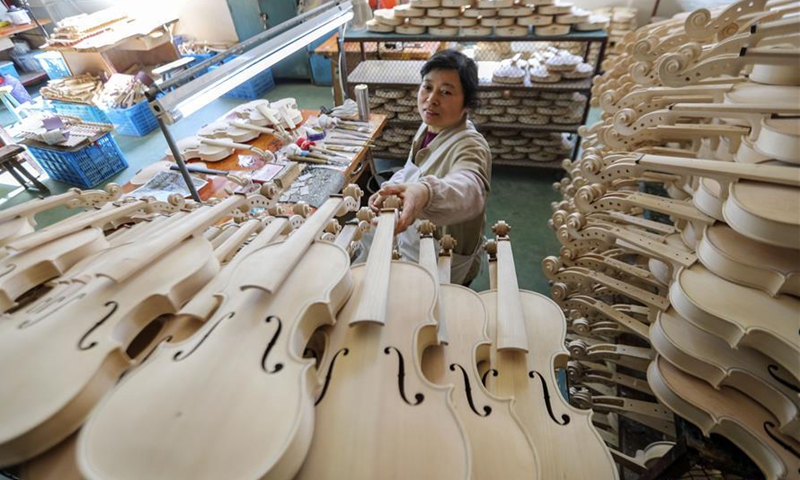 A worker arranges violins at a workshop in Huangqiao Town of Taixing, east China's Jiangsu Province, Nov. 3, 2020. As a famed bowed string instruments manufacturing area in China, Huangqiao Town now has over 200 manufacturers and companies with more than 35,000 employees in the industry. Over 700,000 bowed string instruments are produced here every year, accounting for about 30 percent of the total number made in the world. (Photo by Tang Dehong/Xinhua)