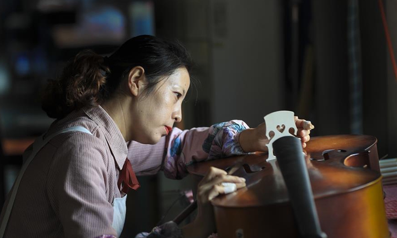A worker checks a cello at a workshop in Huangqiao Town of Taixing, east China's Jiangsu Province, Nov. 3, 2020. As a famed bowed string instruments manufacturing area in China, Huangqiao Town now has over 200 manufacturers and companies with more than 35,000 employees in the industry. Over 700,000 bowed string instruments are produced here every year, accounting for about 30 percent of the total number made in the world. (Photo by Tang Dehong/Xinhua)