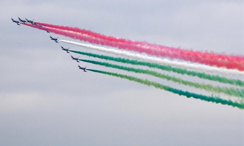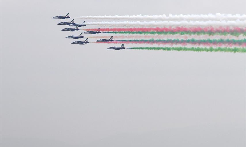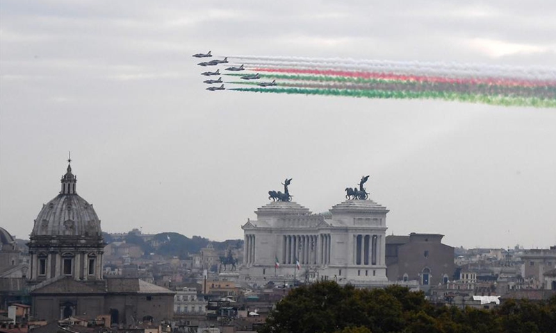 The Italian aerobatic squad Frecce Tricolori performs during a ceremony marking Italy's National Unity and Armed Forces Day in Rome, Italy, Nov. 4, 2020.Photo:Xinhua
