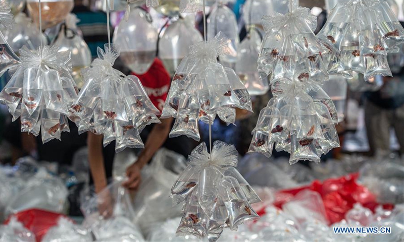 Betta fish for sale are seen at Parung ornamental fish market in Bogor of West Java province, Indonesia, on Nov. 5, 2020. Parung ornamental fish market is the biggest of its kind in Indonesia. (Photo by Veri Sanovri/Xinhua)