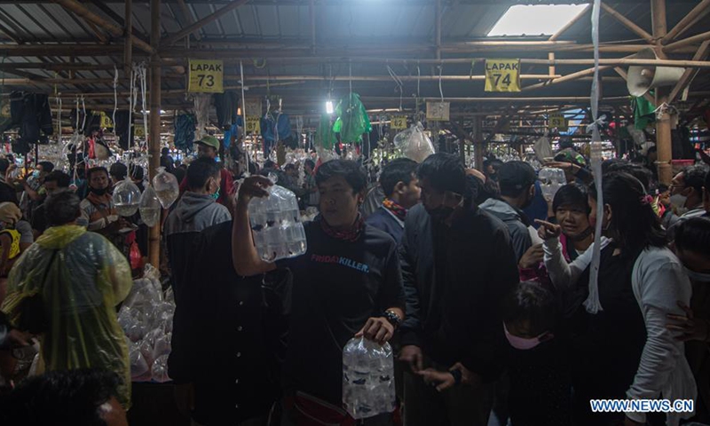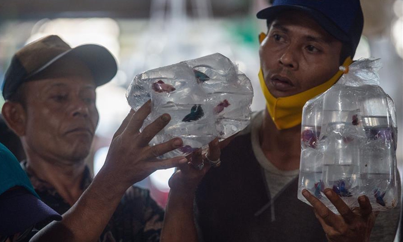 Buyers check betta fish at Parung ornamental fish market in Bogor of West Java province, Indonesia, on Nov. 5, 2020. Parung ornamental fish market is the biggest of its kind in Indonesia. (Photo by Veri Sanovri/Xinhua)