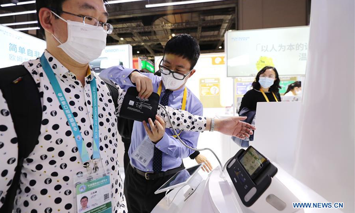 A visitor (1st L) tries on a blood pressure meter at the booth of Omron at the Equipment exhibition area during the third China International Import Expo (CIIE) in Shanghai, east China, Nov. 5, 2020. (Xinhua/Fang Zhe)