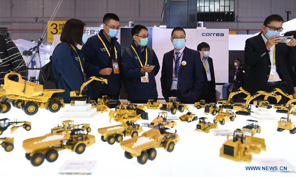 Exhibitors introduce the engineering vehicles at the booth of Caterpillar at the Equipment exhibition area during the third China International Import Expo (CIIE) in Shanghai, east China, Nov. 5, 2020. (Xinhua/Li Renzi)