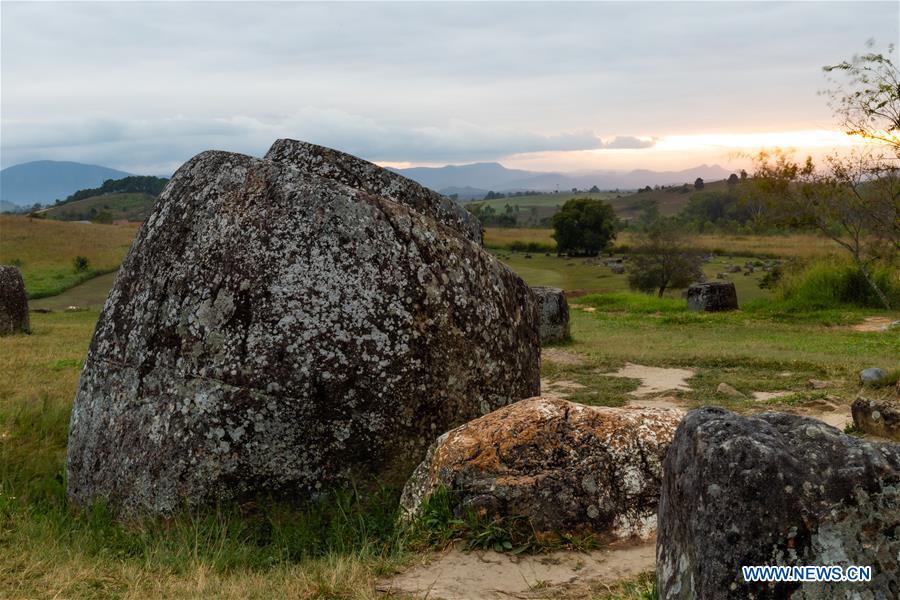 Photo taken on Nov. 3, 2020 shows the sunset view of the Plain of Jars, a megalithic archaeological landscape in Xieng Khuang province, Laos. The Plain of Jars, formally called the Megalithic Jar Sites, was officially inscribed on the World Heritage List at a meeting of the World Heritage Committee held in Baku, Azerbaijan, on July 10, 2019. The Plain of Jars is named for the more than 2,100 tubular-shaped megalithic stone jars that are believed to have been used for funerary practices in the Iron Age, according to the United Nations Educational, Scientific and Cultural Organization. (Photo by Kaikeo Saiyasane/Xinhua)