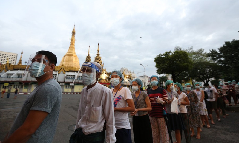 People stand in a queue to vote during a multi-party general elections outside a polling station in Yangon, Myanmar, Nov. 8, 2020. (Photo: Xinhua)