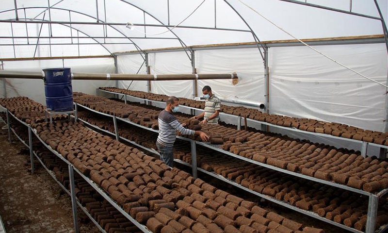 Palestinian workers sort out pomace-wood at an olive press factory in the southern Gaza Strip city of Khan Younis, Nov. 7, 2020. Palestinian workers turn olive oil waste into flammable and eco-friendly pomace-wood that can be used as an energy source for cooking and heating houses at an olive press factory during winter. (Photo by Rizek Abdeljawad/Xinhua)