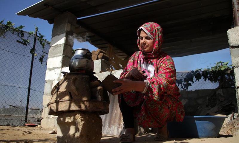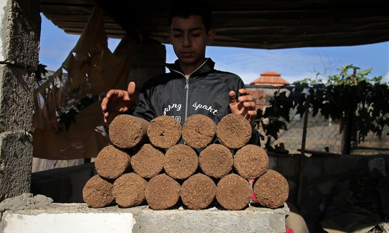 A Palestinian woman uses a pomace-wood to prepare a fire for cooking, at her house in the southern Gaza Strip city of Khan Younis, Nov. 7, 2020. Palestinian workers turn olive oil waste into flammable and eco-friendly pomace-wood that can be used as an energy source for cooking and heating houses at an olive press factory during winter. (Photo by Rizek Abdeljawad/Xinhua)