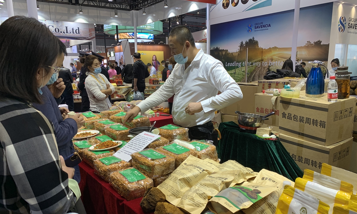 Russian honey, chocolate, cashew nuts, sea cucumbers, pine nut kernels and other products attracted many Chinese consumers who lined up for a taste at the venue of the CIIE in Shanghai on Sunday.