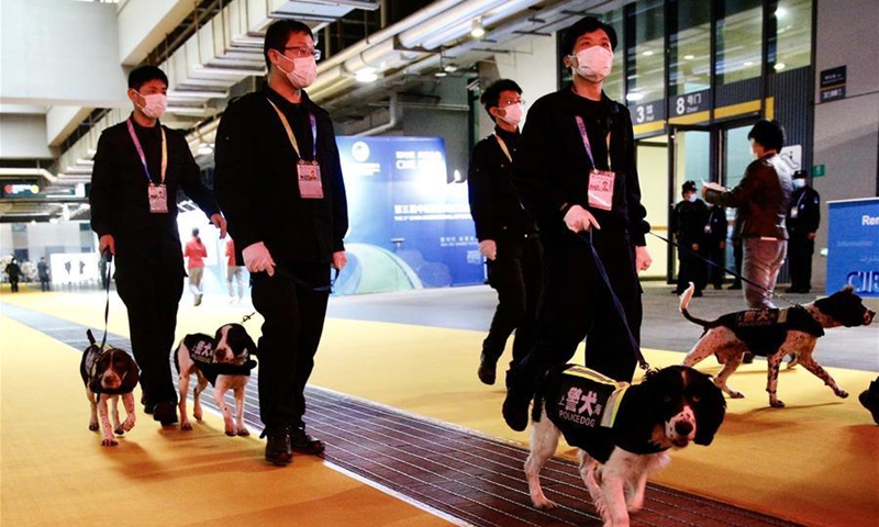 Police dogs patrol the venue of the third China International Import Expo (CIIE) in Shanghai, east China, Nov. 4, 2020. Staff members of different occupations stick to their posts during the 3rd CIIE to ensure the smooth progress of all links. (Xinhua/Zhang Yuwei)