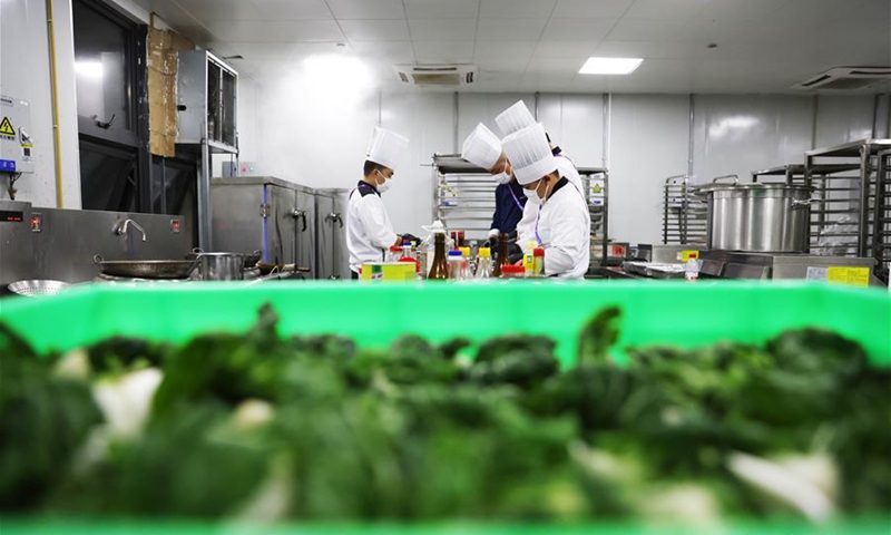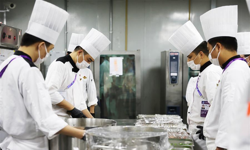 Chefs prepare food at the kitchen during the third China International Import Expo (CIIE) in Shanghai, east China, Nov. 5, 2020. Staff members of different occupations stick to their posts during the 3rd CIIE to ensure the smooth progress of all links. (Xinhua/Lu Ye)