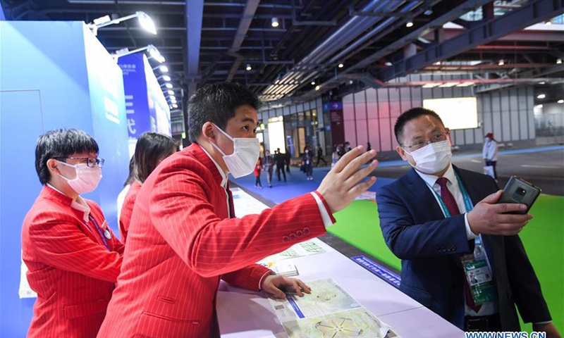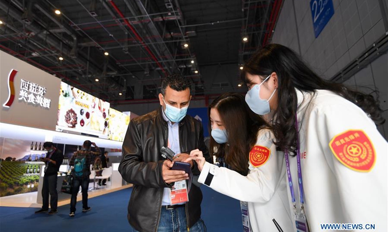 A volunteer provides guidance for a visitor during the third China International Import Expo (CIIE) in Shanghai, east China, Nov. 5, 2020. Staff members of different occupations stick to their posts during the 3rd CIIE to ensure the smooth progress of all links. (Xinhua/Chen Yehua)