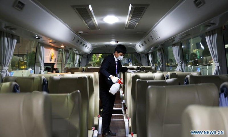 Driver Guo Song disinfects a bus running for the third China International Import Expo (CIIE) in Shanghai, east China, Nov. 4, 2020. Staff members of different occupations stick to their posts during the 3rd CIIE to ensure the smooth progress of all links. (Xinhua/Lu Ye)