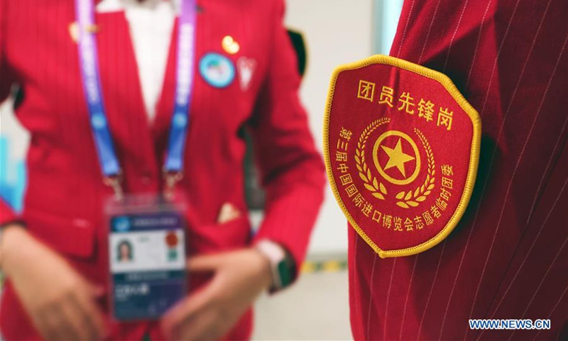 Photo taken on Nov. 4, 2020 shows a badge of a volunteer during the third China International Import Expo (CIIE) in Shanghai, east China. Staff members of different occupations stick to their posts during the 3rd CIIE to ensure the smooth progress of all links. (Xinhua/Lu Ye)